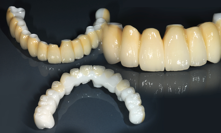 咬合面や舌側などの強度を重視する箇所はジルコニアを使用し、唇側や頬側など個性的な色調表現が必要な部分にだけ陶材を焼き付けた症例。